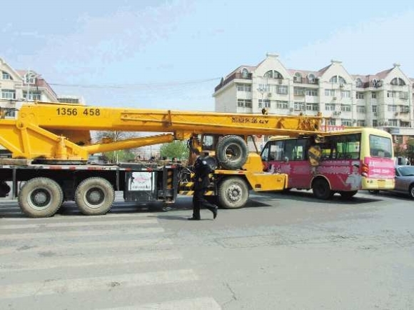 20日上午9点半左右,城区振兴路与新纺街交叉路口,一辆吊车与一辆公交车相撞,吊车前臂插进公交车一侧车窗,还好没有人员伤亡。 本报记者 李璇摄