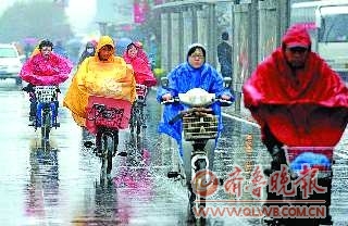 早上8时,上班族像往常一样匆匆赶路,因为春雨的到来,街上不少骑自行车的人都披上了雨衣,步行的人们打起了伞,一块块红的、黄的、绿的颜色填充到了原本是一片黑色的马路上。在经十路,赶着上班的人们身披雨衣行驶在路上,被春雨打湿的路面折射出他们行色匆匆的身影。上学的孩子背着书包,迎着雨,踩着欢快的步子行走在去学校的路上。在他们的身旁是打着伞的父母