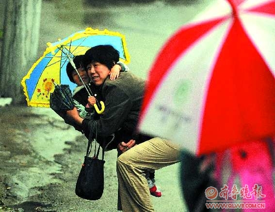 呵护之情洋溢在雨中,格外感人。本报记者 左庆 摄