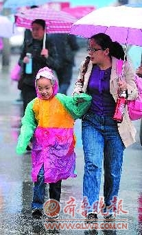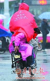 ▲21日早晨,济南街头潇潇春雨中,家长忙着送孩子上学。本报记者 周青先 摄