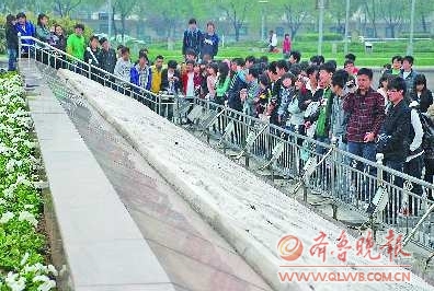 4月21日,山东建筑大学的师生来到泉城广场,大家围着《泉城览胜》浮雕细细品味,泉城的古老文化。 见习记者 王震 摄