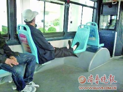 一位老人在乘坐公交时把腿放在前面的座位上,舒服了自己,忘记了文明。