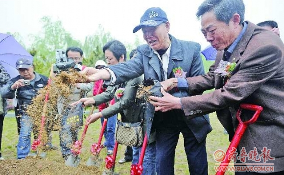 21日上午,200多人齐聚济南长清区山东福寿园老战士纪念广场。随着烈士后人们把从金门岛取来的泥土撒入奠基坑,金门战斗烈士纪念碑奠基了,烈士英魂终归故里。这些土都是烈士后代从金门双手捧来的,每捧一捧他们都会说一声:“亲人啊,跟我们回家吧。” 本报记者 王媛 摄