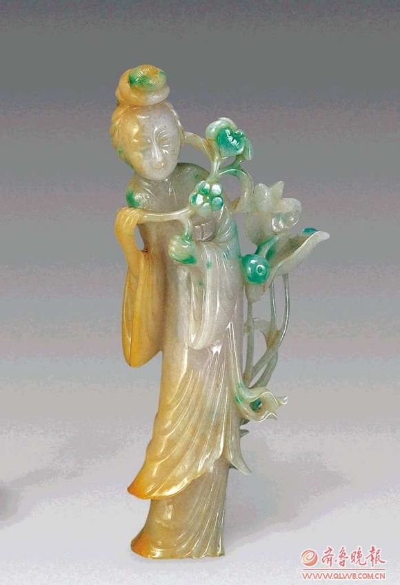 如图为清代“麻姑献寿”翡翠摆件,作品俏色巧雕,立体感很强,将麻姑祝寿的神韵刻画得惟妙惟肖。