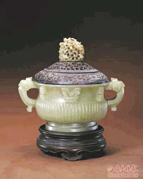簋玉色暗青,圆形,敞口,颈部微内收。簋两侧各有一个兽吞式耳,形为兽头口吞夔形柱。器身两面图案相同,每面各有两个用以装饰的凸戟,中部为凸雕片状兽首,兽首两侧各有一阴线夔纹。簋的腹部排列纵向条纹,其下有圆形圈足。簋为商、周时流行的食器,这件作品为仿古器,造型较商、周古器有所变化。明代,这类仿古簋可用于室内陈设,也可用于燃香。此簋的木盖为清宫所配,紫檀木质,上雕仿古云纹及镂空卷草纹,盖钮为元代玉件。从木盖的形式上看,此物在清代宫廷中曾作为贮放香料的香薰。