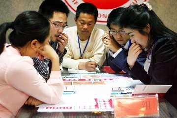 下午两点,对抗赛正式开始,30名选手被分为6组,每组5人。现场评委王先生是一位企业管理培训师,他介绍,这种比赛模式中,每个小组的成员将分别担任公司中的重要职位,如执行总裁、首席财务官、市场总监、生产总监等。每队要亲自经营一家拥有同样资产的企业,连续从事4年的经营活动。面对同行竞争、产品老化、市场单一的情况,公司要如何保持成功及不断成长,是每位成员面临的挑战。