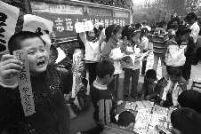本报4月21日讯(记者孙国祥)21日,在潍坊志远小学操场上,小学生摆起书摊推销旧书。他们用自己的旧书,跟不同班级年级的学生进行交换或者买卖,把不用的旧书变废为宝。