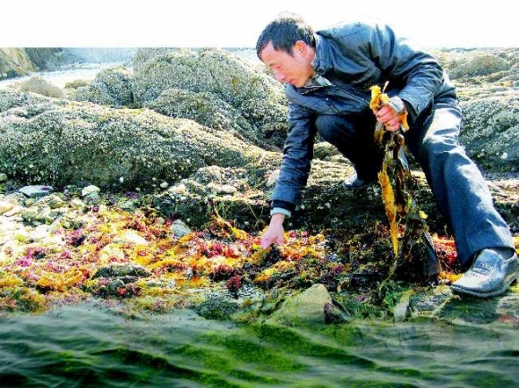 20日,记者在栈桥及月亮湾海域看到,近海附近漂满了绿色的海藻,并在大风的“鼓动”下,随着海水的涌动不断地向岸边聚积。远远望去,绿色的海藻铺在覆盖在岩石上,像给大海镶了个绿边。据海洋专家介绍,这些海藻主要是海青菜和海带,对海洋环境不会造成危害。一位月亮湾景区的工作人员介绍说,这些海藻每年都会有,这应该是今年第一次大规模的海藻上岸。