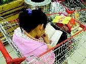 作品描述:一个小姑娘坐在购物车里边吃饼干边看书,真是太用功了。