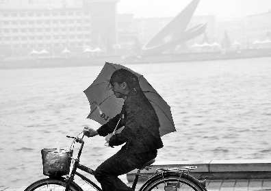 4月21日,一位市民撑着被风吹变形的雨伞在烟雨朦胧的德州新湖边行过。大风加上阵雨,给德州市民的出行增添了许多不便。 本报记者 苏超 摄