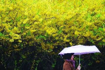 21日,一场小雨淅淅沥沥地洒落岛城,在辽源路上,一位市民撑伞从盛开的迎春花墙下走过。据气象部门消息,当日市区最低气温达到9.6℃,22日,气温将有所回升。
