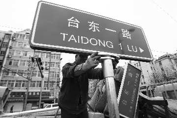 21日,在台东一路上,工人正在更换新路牌。据工人介绍,与原来的路牌相比,新路牌具有防锈和反光功能,更耐用。自4月份开始,全市1000余块路牌陆续被更换,本月底将更换完毕。