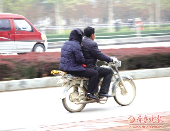 21日,两名市民身着冬装骑车行驶在泰山大街上。21日泰安最高气温下降了7度左右,预计22日泰城最低气温在9℃左右。