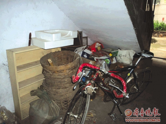 在12号楼3单元记者看到,楼梯下面的空间里放着一堆废旧酒盒,一组丢弃的木质家具,还有几个箩筐,一袋黑乎乎的、不知道装着什么东西的编织袋。而旁边又放着一辆自行车让很狭窄的空间显得更加拥挤,记者需要侧着身子走过这个楼道。