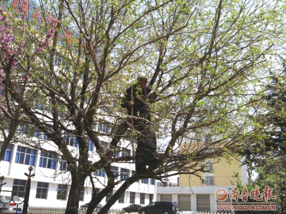 16日,记者在东岳大街西段一加油站附近看到,一位老人正在一棵距离地面四五米高的榆树上十分。