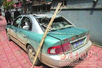 现场还残留着一根一米多长的竹竿。那家酒店保安告诉他,两三个小伙用随手捡来的竹竿、石块外加飞踹,把车折腾了十来分钟。