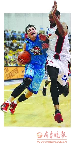 4月24日,新疆广汇汽车队球员西热力江(左)在比赛中带球突破。当日,在2010-2011赛季中国男子篮球职业联赛总决赛第五回合比赛中,广东东莞银行队主场以110:104战胜新疆广汇汽车队,总比分以3:2领先。新疆队只有在最后的两场比赛中全部获胜,才能获得总冠军。 新华社记者 卢汉欣 摄