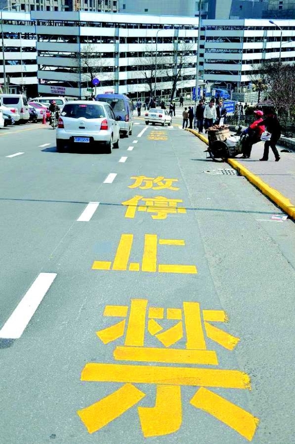 毓璜顶医院门前路段的交通问题一直备受关注,由于道路宽度等基础条件暂时无法改变,而车流却有增无减,交警部门采取了这一整改措施。 温全福 摄