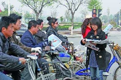 23日早上,工作人员在市区各大路口和车展现场分发本报车展特刊。 本报记者 马志勇 摄