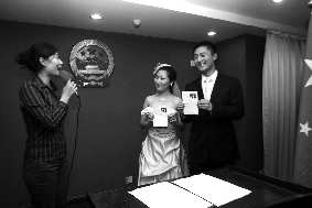 4月23日是中国人民解放军海军成立纪念日。在青岛市市南区民政局婚姻登记处,来自北海舰队的赵杨和张明祥身着婚纱和礼服举行“婚礼式颁证”仪式。据介绍,他们都在部队基层,工作比较繁忙,无法抽时间准备婚宴,所以他们选择这种简单又节俭的方式登记结婚。自2009年6月以来,市南区共有60多对新人选择“婚礼式颁证”形式结婚。