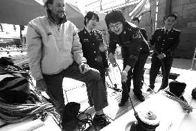 22日,在青岛奥帆中心,法国帆船运动员邀请青岛边检站工作人员上船体验。据介绍,边检移动警务车直接开到奥帆中心方便运动员快速通关,而运动员则邀请他们上船过了一把帆船瘾。