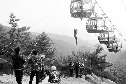 为应对“五一”旅游高峰,日前蒙山国家森林公园(蒙阴)云蒙景区,举行了一场客运索道急救演练。图为“游客”被困在轿厢内,通过索道进行救援。