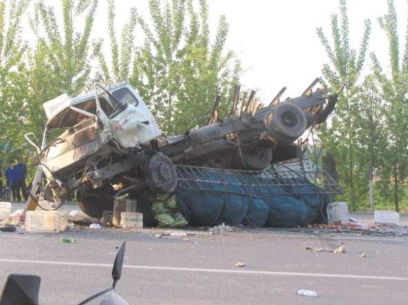 一辆黄色吊车停在QQ轿车和卡车中间,正在吊起河南籍牌照的卡车,卡车车头向西南方向侧翻,车厢已经和底盘分离,车上拉的西红柿、蒜薹等蔬菜和白色菜筐撒在路面上,卡车被吊起后,一名男子被救出,装进黄色袋子,送上了另一辆殡仪车。