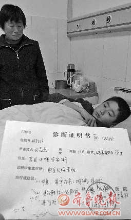 在莒县人民医院肝病住院区,孙云亮13岁的儿子孙志杰正躺在病床上。在病床旁边放着—张诊断证明书,治疗或建议—栏写有:休息,保守治疗,并且建议转往上级医院进行肝移植。