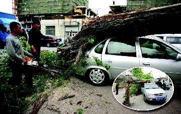 当记者从水库路向西转入仓南街300米处时,见到一棵直径约0.5米的杨树倒在一辆银灰色轿车上,几名工人正在用电锯切割杨树。一半已经枯萎的杨树是从下部断裂的,并没有连根拔出,树干中部“搁”在轿车的尾部。由于杨树很重,整辆车的底盘压得很低。
