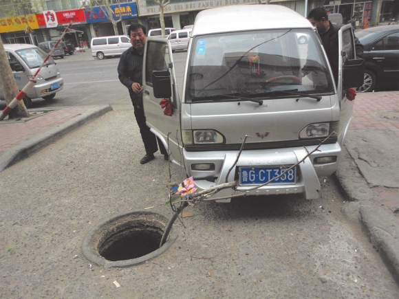 记者来到小区门口看到井盖完全不见踪影,井中插着一根伸出地面约1米高,1.5米宽的树杈,勉强起到提醒路人的作用。原公路局宿舍小区与向阳路之间是出入小区的人行道,而这个“张着大口”的井口就位于这段人行道上,过往行人稍不注意就很容易掉进去。路口本来就很窄,有车辆的时候更是寸步难行,记者正好遇见一辆小面包被井口挡住进退两难。