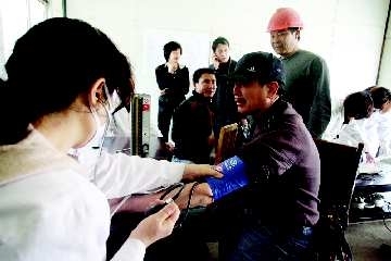 本报4月24日讯(记者孙国祥)22日,在潍坊市东风街的一处工地上,来自中学街社区的医护人员为这里的农民工进行身体检查,不少农民工告诉记者,长年在外打工,他们基本上没有查体的机会。