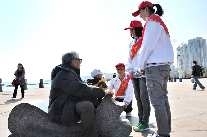 24日,在烟台滨海广场,大学生志愿者组成的文明督导员正在巡逻。据悉,由烟台市广场管理处与烟台职业学院公共管理系联合组织开展的“文明城市,志愿相随”活动24日正式启动。