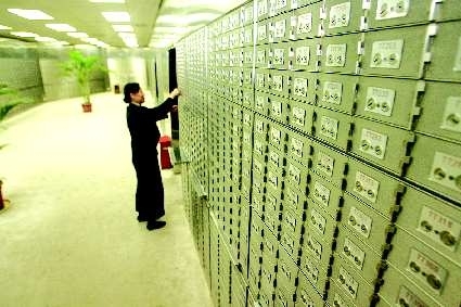 25日下午,记者在中行工作人员的引领下进入了保管箱库房。据介绍,客户进入库房都要经过指纹验证确定身份,然后才能在工作人员的陪同下进入库房。每个保管箱都有两个锁,一个由银行管理人员开启,一个由租户自己打开,只有一个人是打不开保管箱的。银行保管箱库房完全按照金库的标准设计,实行全封闭管理,内部有多个独立的防盗监控装置和自动报警装置,还有24小时的武装警卫。银行保管箱都是从国外引进的,造价不菲。库房内一年四季采用恒温、恒湿控制,墙壁和库门具有防盗、防火、防水的功能,可以防止珍贵物品因霉变、虫蛀而意外损坏。