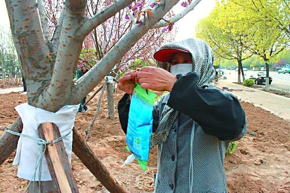 4月25日,记者在府前大街看到园林工作人员正在给刚刚栽种好的树木“输液”。工作人员介绍,这是在为移栽的树木输入营养液,“东营的土质不好,会影响树木的成活率。输营养液主要是为了增强树木的抗逆性,提高移栽成活率。”