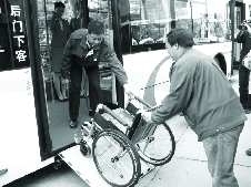 25日,与上海世博会期间同样的电动公交首次在青岛沿海一线亮相。当日上午9点,青岛市试运行纯电动公交车交接仪式在市政府办公楼前举行。这标志着由上海汽车工业(集团)总公司提供的4辆纯电动公交车和临沂中文沂星电动汽车有限公司提供的5辆纯电动公交车在青岛正式投入试运行。图为世博用的电动公交专门设计的残疾人专用轮椅通道。 本报记者 赵波 摄影报道