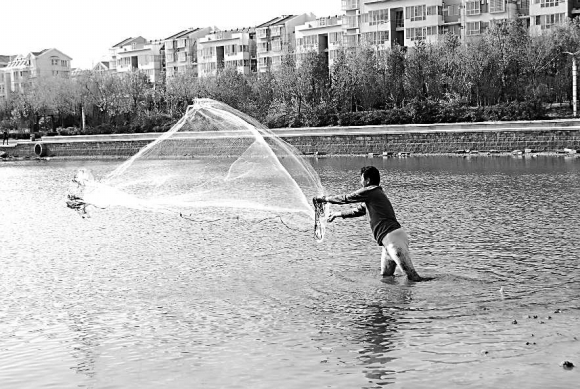 4月26日下午,在辽河路护城河边,一位市民正在撒网捕鱼。该市民介绍,“近来护城河内清淤工作已基本完成,河里的鱼很多,一网撒下去能捕到不少。”