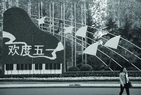 26日,在东海路上,由黄、红色绢花摆成的钢琴造型吸引了不少行人的目光。据了解,这架“花琴”长20米、高7.1米,下方用一串红、万寿菊、矮牵牛等5.5万盆鲜花装饰美化,庆祝即将到来的“五一”国际劳动节。 本报记者 张晓鹏 摄影报道