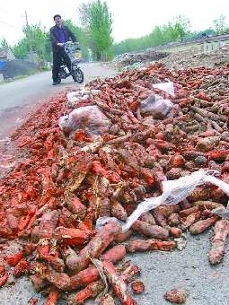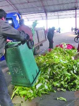与此同时,记者在现场看到,坏掉的白菜叶子堆了一地,正在往农用三轮车上清理这些烂菜叶的闫师傅告诉记者,“天热了,白菜烂叶子也快,再说了,扒掉一层叶子,好让白菜有个好卖相,我们一天要拉10趟烂菜叶。”记者采访到,如今刚刚上市的大棚白菜主要来自寿光,从菜农手中的收购价为3分钱一斤。