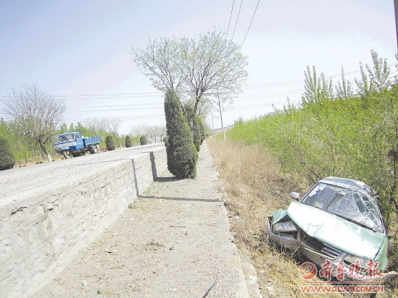 4月26日中午,在老泰肥路一处撒满了石子的路段,一辆出租车为躲车刹车失灵,一头冲进了路边的沟里,司机手臂被刮伤。