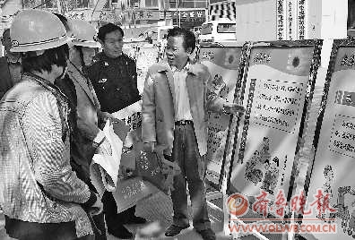 26日是全国疟疾日,今年宣传活动的主题是“消除疟疾、履行承诺”。当天济宁市疾控中心联合山东省寄防所组织了针对疟疾防治科普活动。图为山东省寄防所的工作人员通过宣传版为附近工地的农民工讲解疟疾的判断与治疗等知识。