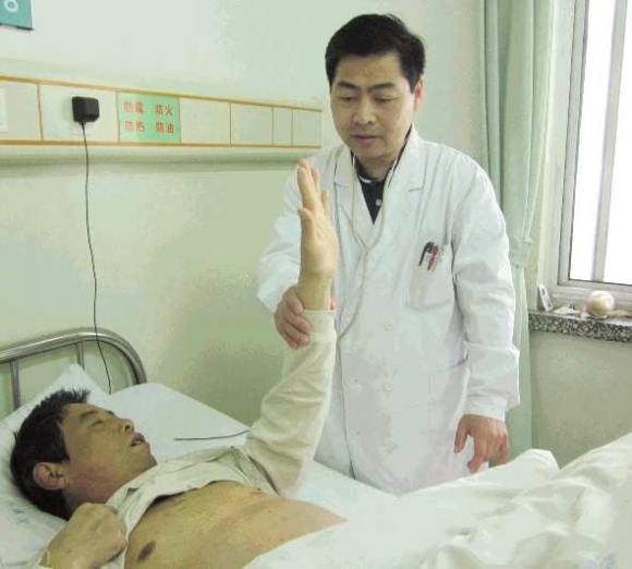 聊城市人民医院感染科主任王思奎教授在病房,为肝病患者做康复指导。近年来,在王思奎主任的带领下,肝病治疗取得长足发展,慕名前来就诊的病人越来越多,特别是肝病病房开展的干细胞移植治疗肝硬化获得了很好的疗效。