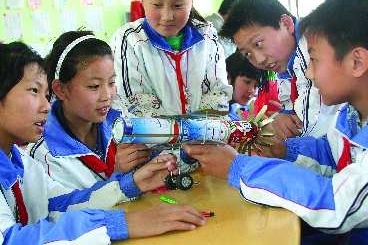 4月27日,几名学生正在用易拉罐、电线等废旧生活物品制作“飞机”。枣庄市薛城区双语实验小学,通过开展环保手抄报制作大赛、“我的环保生活”征文比赛、废弃物品设计大赛、“绿色班级”生态角评比等活动,使师生认识到节约的重要性,并争做“低碳一族”。