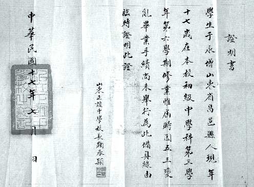 “五三惨案”发生后,姥爷被迫回到老家,“国破尚如此”,读了三年书拿不到文凭也就显得不那么的重要。但过了两个月,他就收到了母校寄来的信,信封上印着“山东正谊中学校”的字样,中间的收信栏里写着“于永增修业证明书”。信上没有收信人地址,也没有邮票,信是怎么拿到手的已经无从知道。