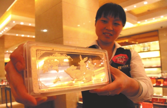 本报4月27日讯(记者吴凡)27日,在潍坊鑫源金店,工作人员展示了一款两公斤重的投资银条。据了解,随着银价的不断攀升,市民“炒银”的热情也随之升高,投资银条变得十分受宠。