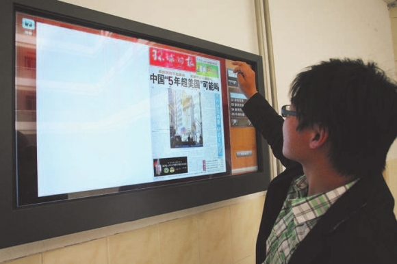 27日,记者来到潍坊学院图书馆一楼大厅,在自修室外的墙壁上镶嵌着一块42寸的液晶屏幕,几名大学生围观在周围用手指触摸着屏幕浏览新闻信息,这就是该图书馆刚引进的数字阅报机。记者看到该数字阅报机具有任意翻页、放大功能。在首页上显示了人民日报、法制晚报、环球时报等12种报刊。