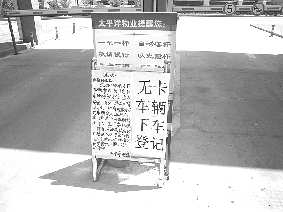 27日,在新桥国际佳苑小区门口,一张写有“无卡车辆下车登记”八个字的告示牌,十分醒目地摆在小区出入口正中间的位置。