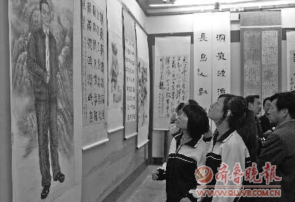 27日,济宁市教育系统在市博物馆举办庆祝建党90周年暨书画作品展活动。首次展出的作品涉及廉政警句、名人名言、诗词联赋等内容。图为几名中学生在书画展现场参观。