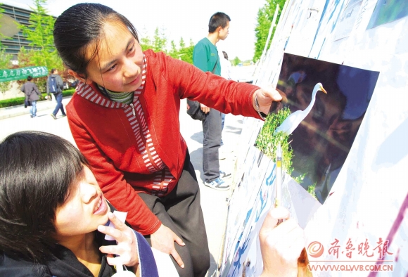 27日,山东农业大学生命科学学院“飞”动植物艺术协会,在山东省爱鸟周之际,举办了爱鸟艺术作品大赛。图为大学生在野生鸟类保护知识展览活动中观赏鸟类图片。