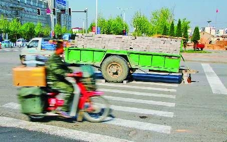 9时20分,记者在现场看到,这辆拖拉机的车头已经被开走,只剩下满载着砖头的车斗停在斑马线上,车斗的拉杠用一只千斤顶顶起,事发的马路路面因车斗的重力砸出了一个巴掌大的陷坑。