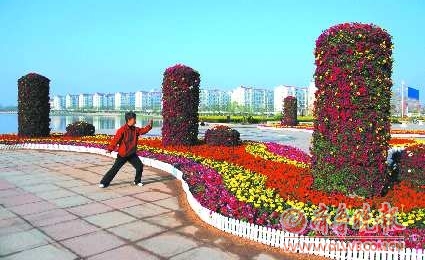4月27日,一市民在滨州市彩虹湖花柱边晨练。历时一个月的城区“五一”节日摆花工程已于近日全面完成。今年“五一”摆花品种仍以传统的草花矮牵牛、金盏菊、长春花、一串红、四季海棠为主,用花量超过了百万盆。 本报通讯员 窦玉芹 张磊 本报见习记者 王传宝 摄影报道